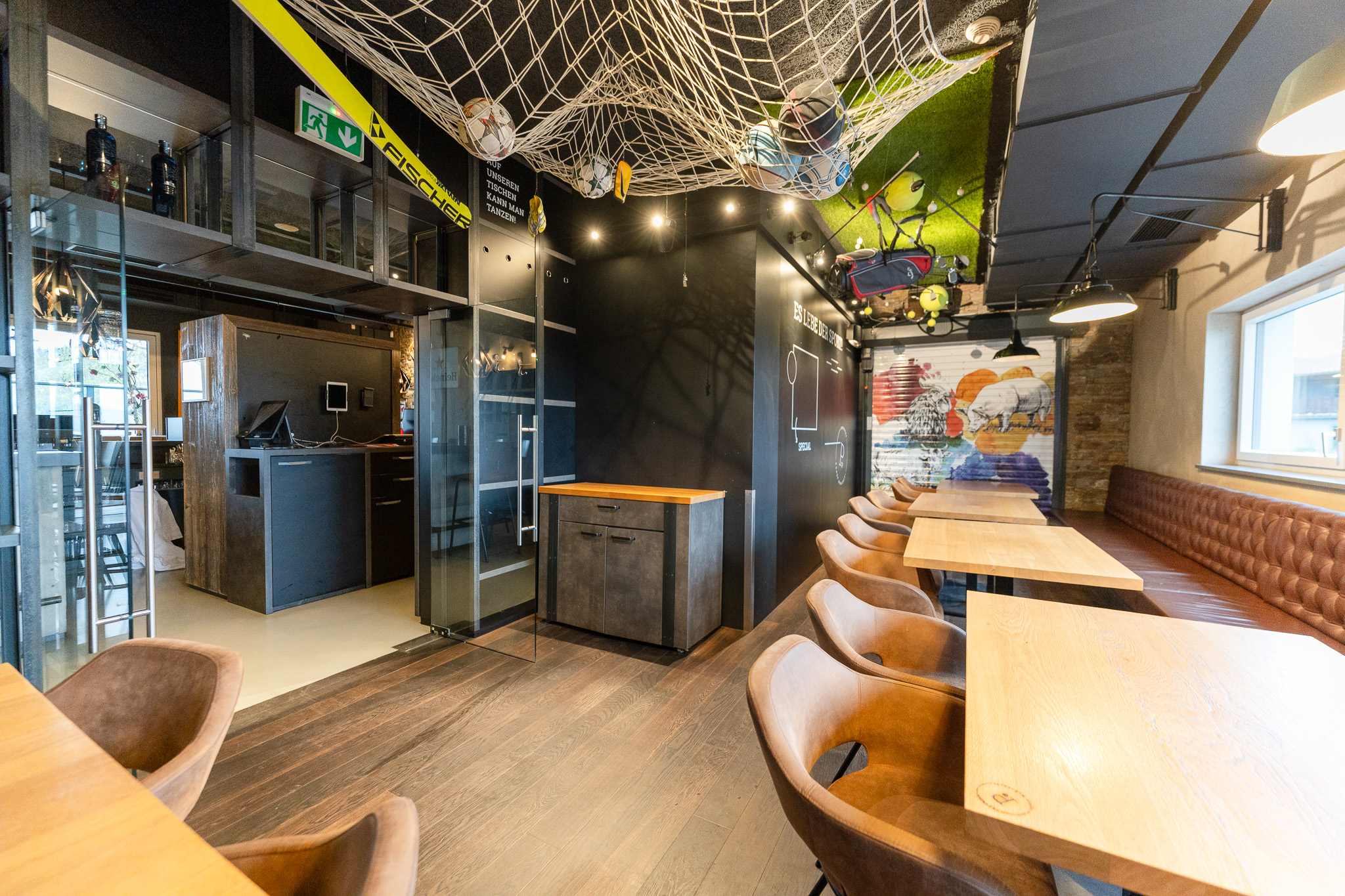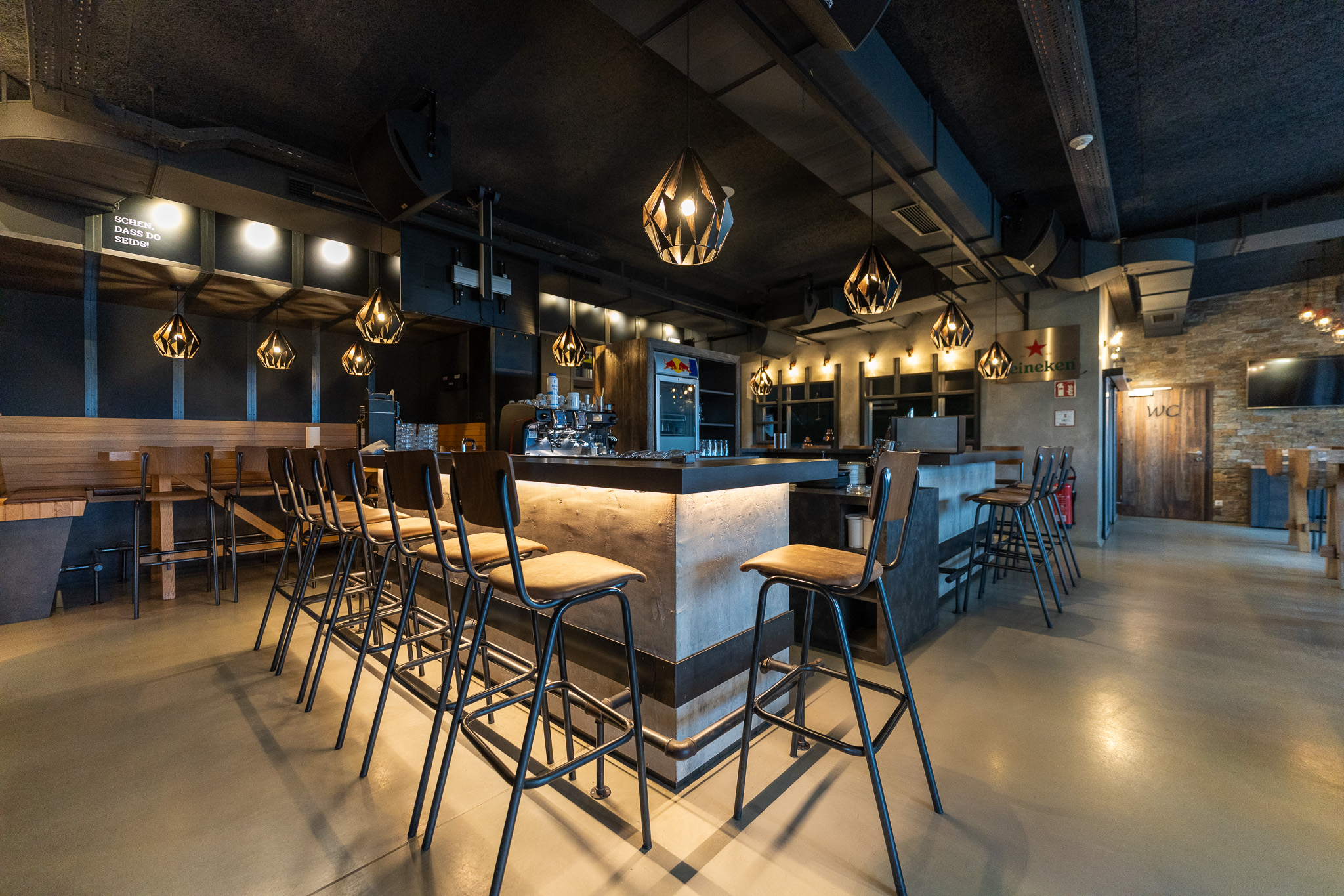 Professionell ausgestattete Bar inkl. Kaffeemaschine, Barhocker, Schankanlage, Sumpf, Kühlladen etc. sowie Orderman-System