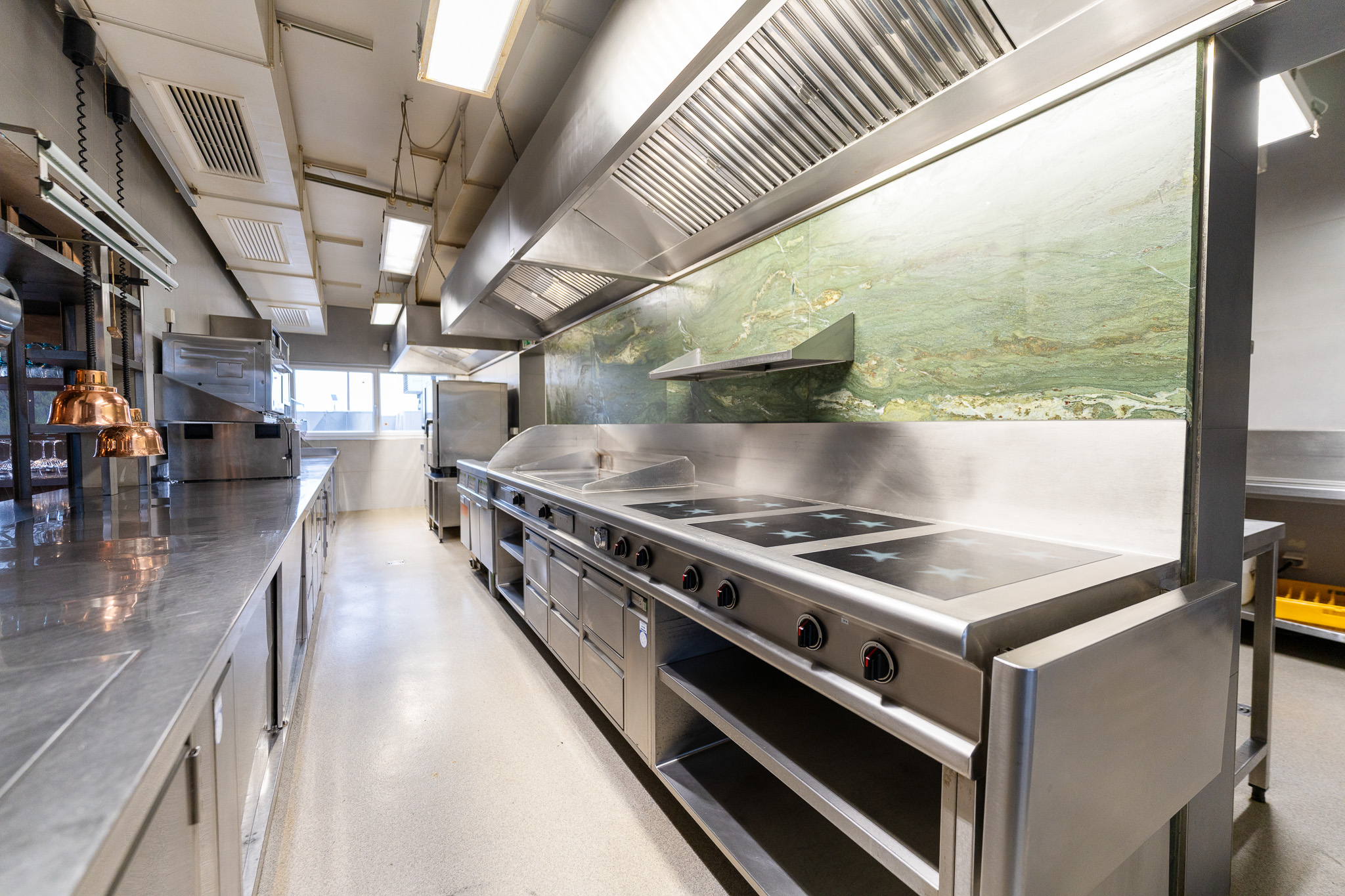 Voll ausgestattete Küche inkl. Geräte (u. a. Geschirrspüler, Fritteusen, Weinkühlschrank, Eiswürfelbereiter)